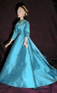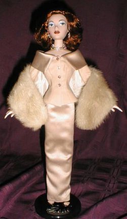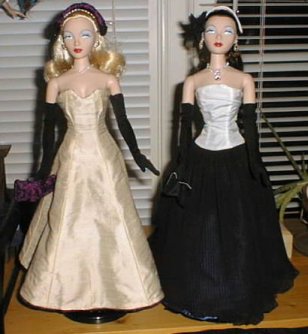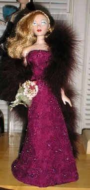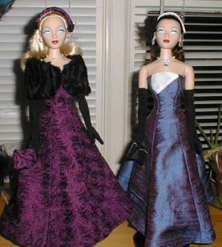 These lovely reversible dresses were made by someone named Carol who sells through Gigi's Doll House in Chicago (I think). The shearling stole on the left is by Wendy of Hollywood Bakery. |
